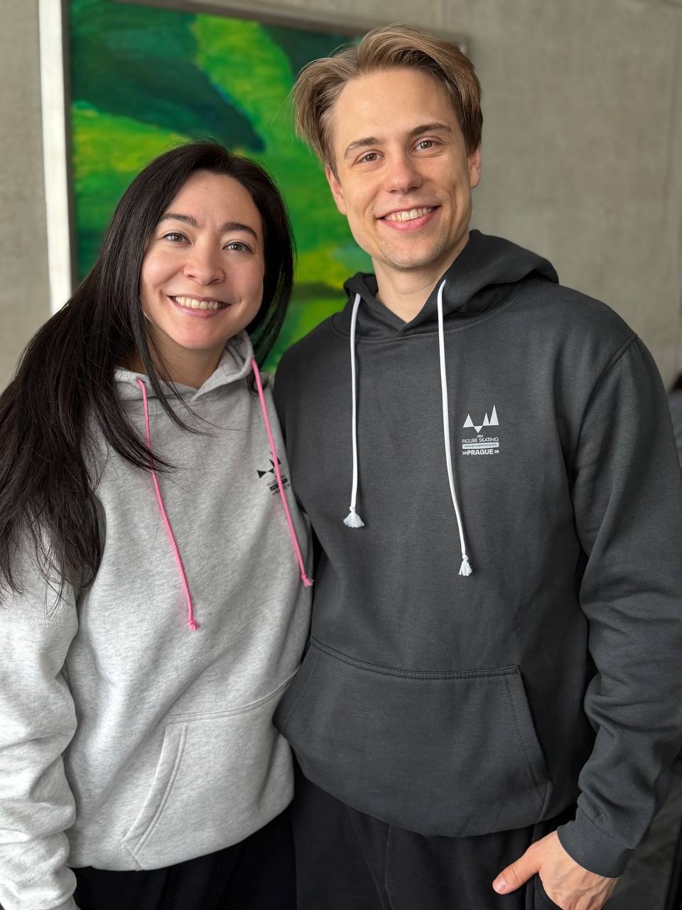 The hoodies in the photos are modeled by another ice dance team — Lithuanian skaters Allison Reed and Saulius Ambrulevičius.
